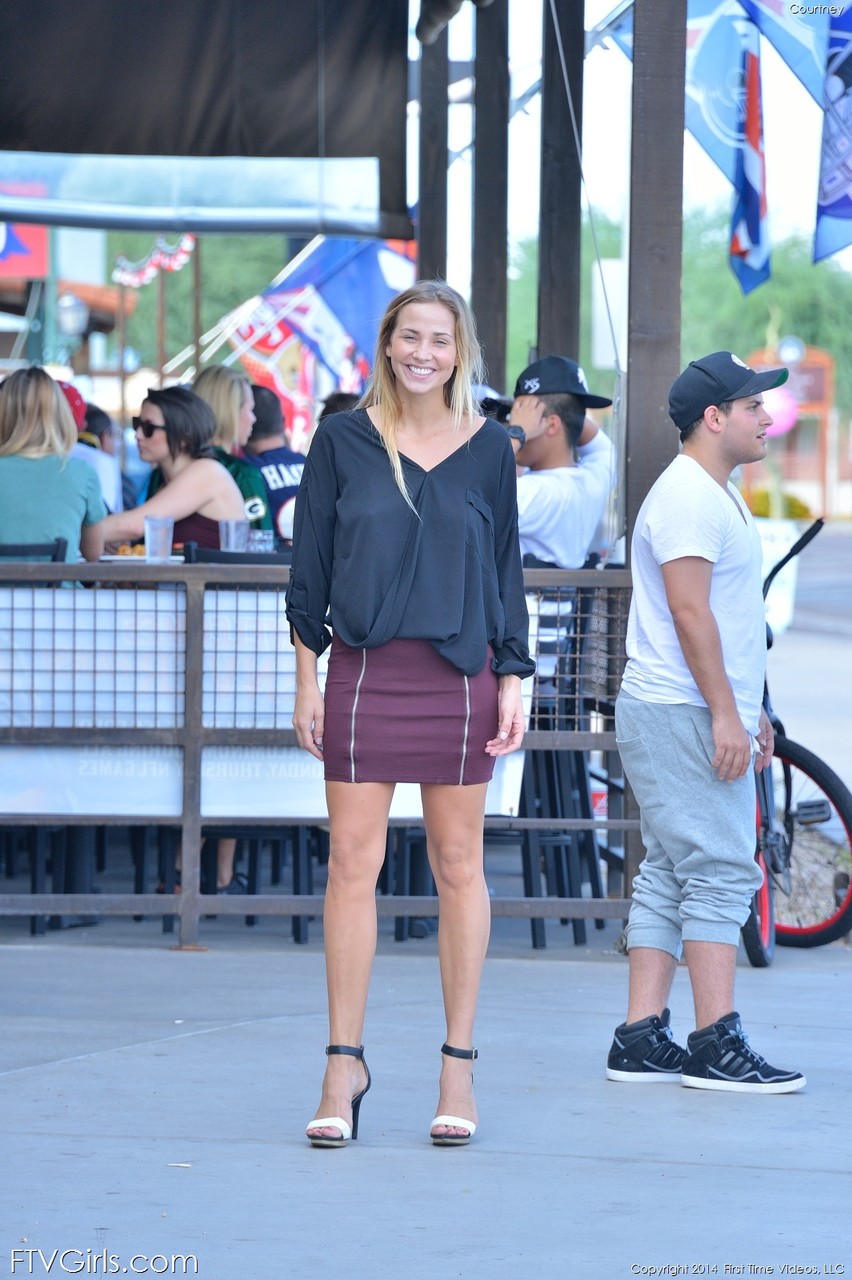 Glamorous blonde in a miniskirt Courtney flaunting her nice tits in public